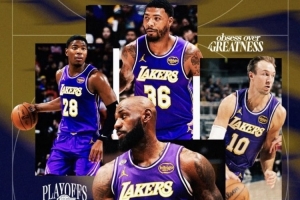 值得一提的是,在这张湖人官方活动宣传海报中亮相的四位球员为詹姆斯、斯玛特、八村塁、肯纳德,并无两位伤员东契奇和里夫斯的身影。